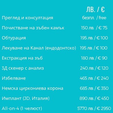 Офертата включва: екстракции (при нужда), 4 италиански импланта (доживотна гаранция), фиксирани временни зъби, постоянни зъби, контролни рентгенови снимки и др.