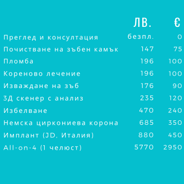 Офертата включва: екстракции (при нужда), 4 италиански импланта (доживотна гаранция), фиксирани временни зъби, постоянни зъби, контролни рентгенови снимки и др.