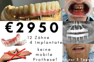 Das Angebot beinhaltet: 3D-Scan, Voruntersuchung, alle Extraktionen (falls erforderlich), 12 Zähne aus hochwertigen Kunststoff auf 4 hochwertigen Titan Implantaten (lebenslanger Garantie) in 3–5 Tagen, Kontrollröntgenbilder, usw.