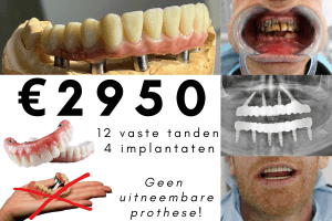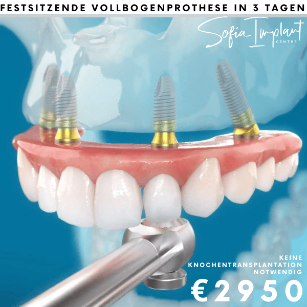 12 Zähne auf 4 Titan Implantaten ALL-ON-4 (2950€ pro Kiefer) Das Angebot beinhaltet: 3D-Scan, Voruntersuchung, alle Extraktionen (falls erforderlich), 12 Zähne aus hochwertigen Kunststoff auf 4 hochwertigen Titan Implantaten (lebenslanger Garantie) in 3–5 Tagen, Kontrollröntgenbilder, usw.
